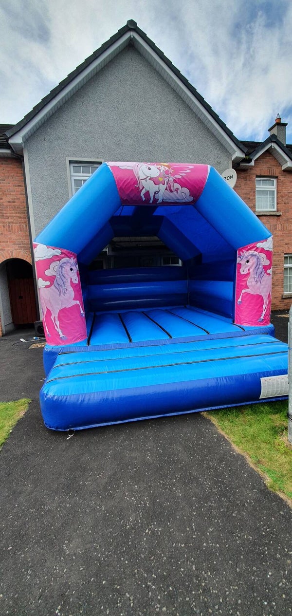 Blue bouncy castle with paw patrol theme or unicorn theme